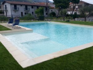 Alla piscina si accede con una scalinata semicircolare con maniglione in acciao inox 316L. Lo stesso acciaio è stato utilizzato per bocchette, fari ed ogni altro accessorio della vasca.