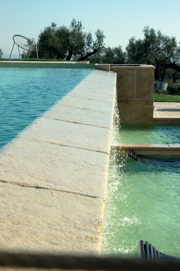 In questo caso l’acqua tracima da uno o più lati della vasca principale senza canale o griglia visibile, creando un effetto di continuità totale tra lo specchio d’acqua e il paesaggio.